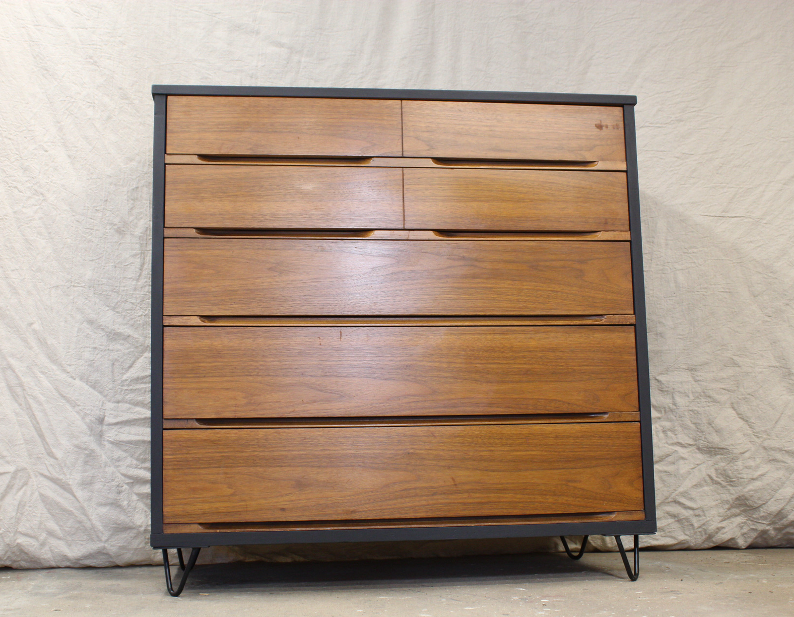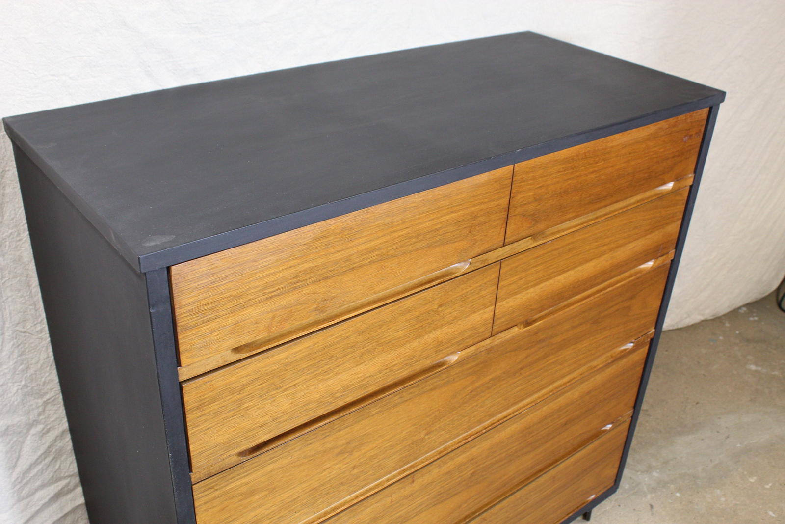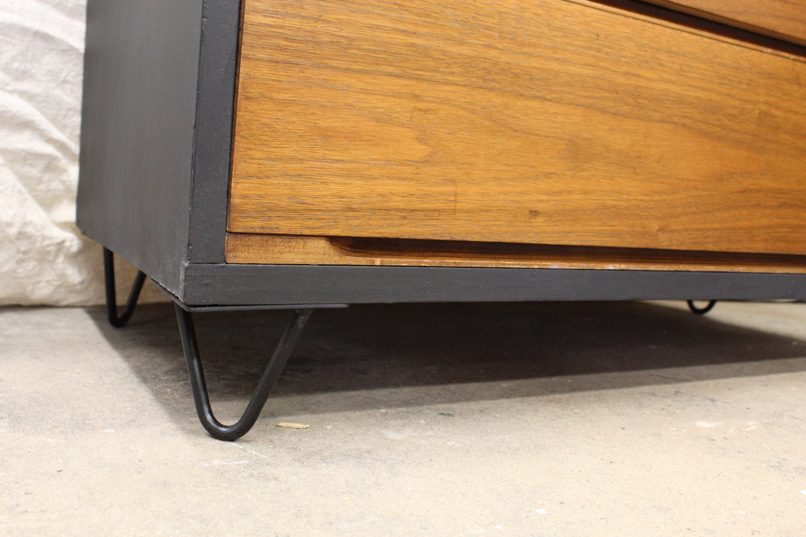 The original dresser had damage to the top and side veneers and was missing it’s original legs. I decided to keep drawers original and just sand and stain them, but opted to paint the rest of the cabinet. I ordered hairpin legs and gave it new life.